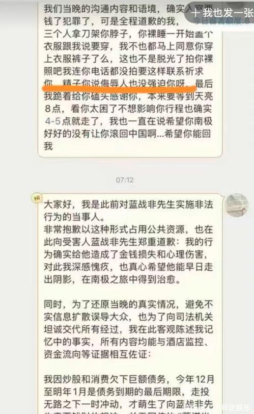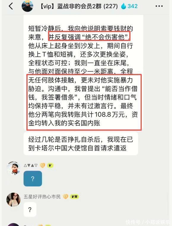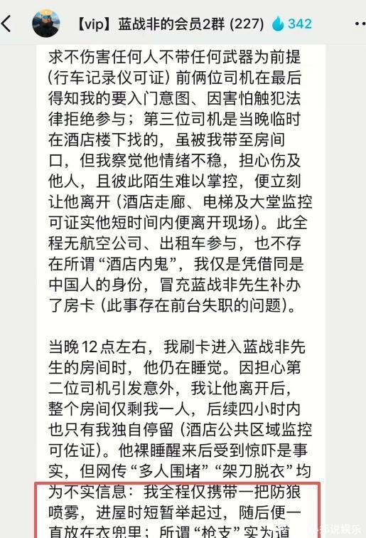 据悉,绑匪最初是私信蓝战非求饶,没有得到本人回应后,他居然还花钱开了蓝战非粉丝群的会员,在群里直接发声。按照他的说法,他虽然入室抢劫了,但态度很谦卑,全程都在道歉。也没有如蓝战非所说让他脱掉衣服,拿到抵着蓝战非让他自取精液。绑匪称蓝战非本就没穿衣服睡觉,绑匪进来后蓝战非想穿上衣服,绑匪也同意。